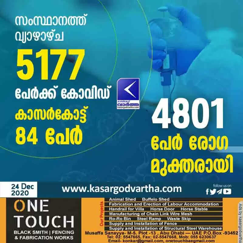 സംസ്ഥാനത്ത് വ്യാഴാഴ്ച 5177 പേര്ക്ക് കോവിഡ്; കാസര്കോട് 84 പേര്