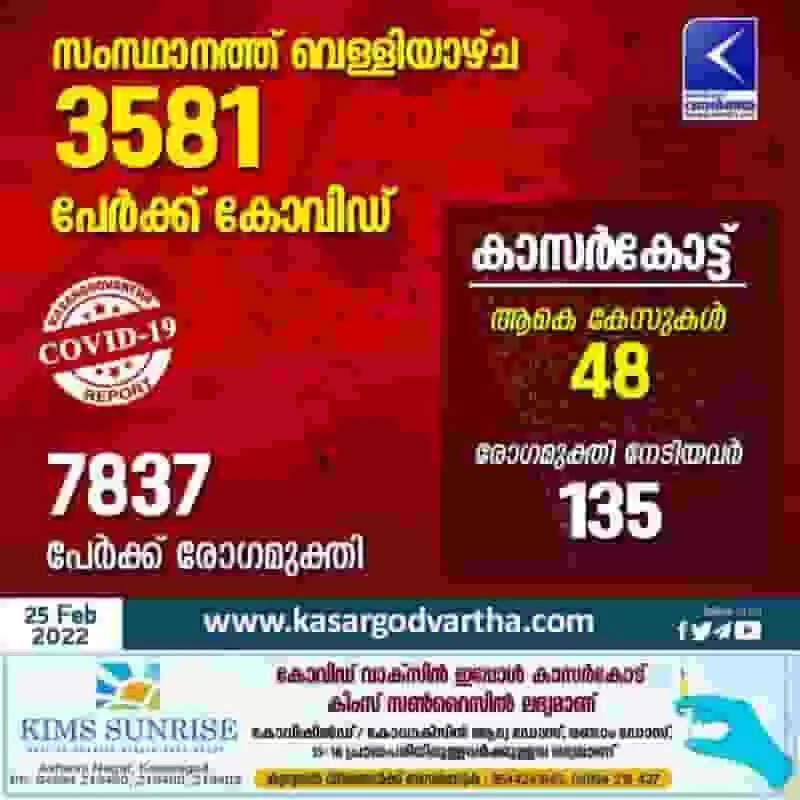 കേരളത്തില്‍ വെള്ളിയാഴ്ച 3581 പേര്‍ക്ക് കോവിഡ്: കാസർകോട് 48 പേര്‍