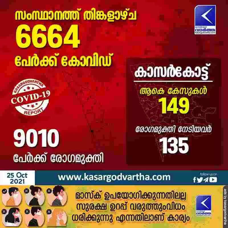 സംസ്ഥാനത്ത് തിങ്കളാഴ്ച 6664 പേർക്ക് കോവിഡ്; കാസർകോട് 149 പേർ