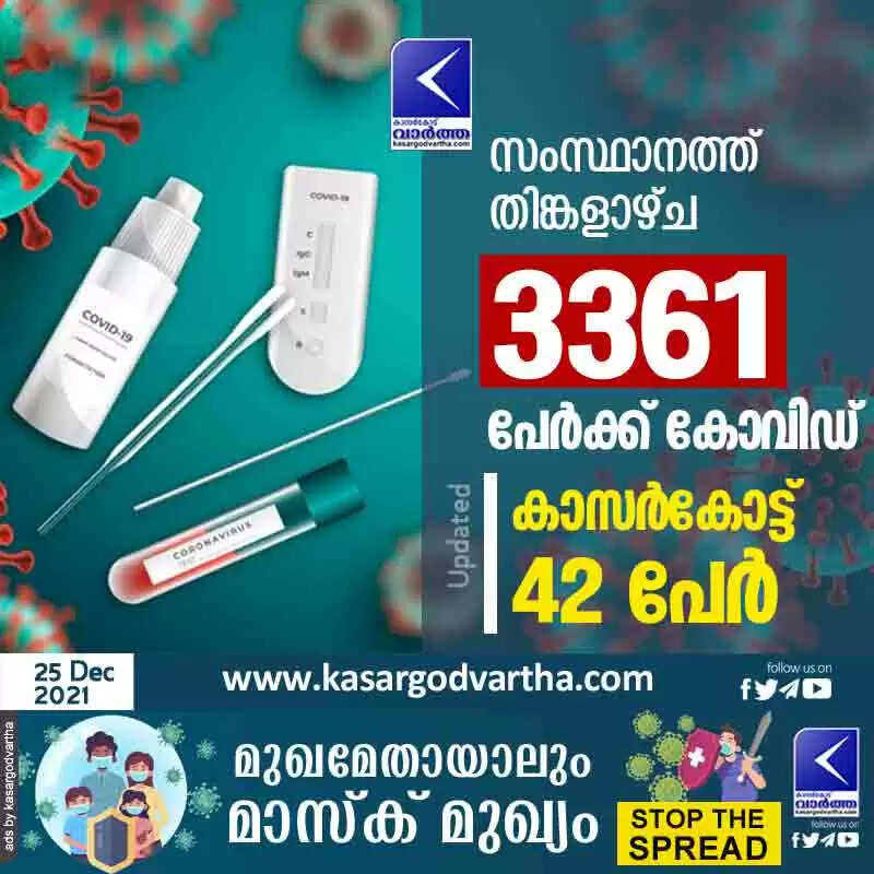 സംസ്ഥാനത്ത് തിങ്കളാഴ്ച 3361 പേര്ക്ക് കോവിഡ്; കാസര്കോട് 42 പേര്