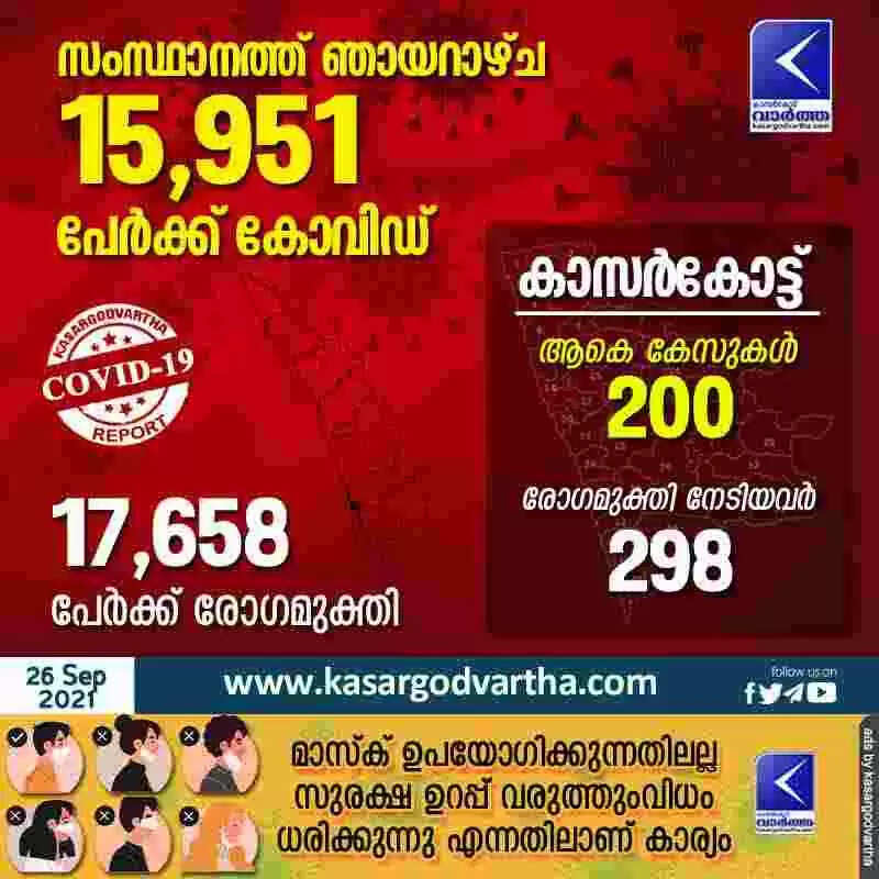 സംസ്ഥാനത്ത് ഞായറാഴ്ച 15,951 പേര്ക്ക് കോവിഡ്-19 സ്ഥിരീകരിച്ചു; കാസര്കോട് 200 പേര്