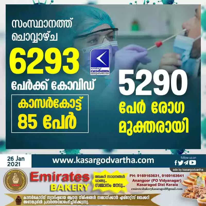 സംസ്ഥാനത്ത് ചൊവ്വാഴ്ച 6293 പേര്ക്ക് കോവിഡ്; കാസര്കോട് 85 പേര്