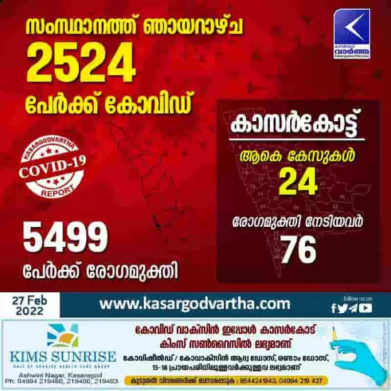 കേരളത്തില് ഞായറാഴ്ച 2524 പേര്ക്ക് കോവിഡ്: കാസർകോട് 24 പേര്