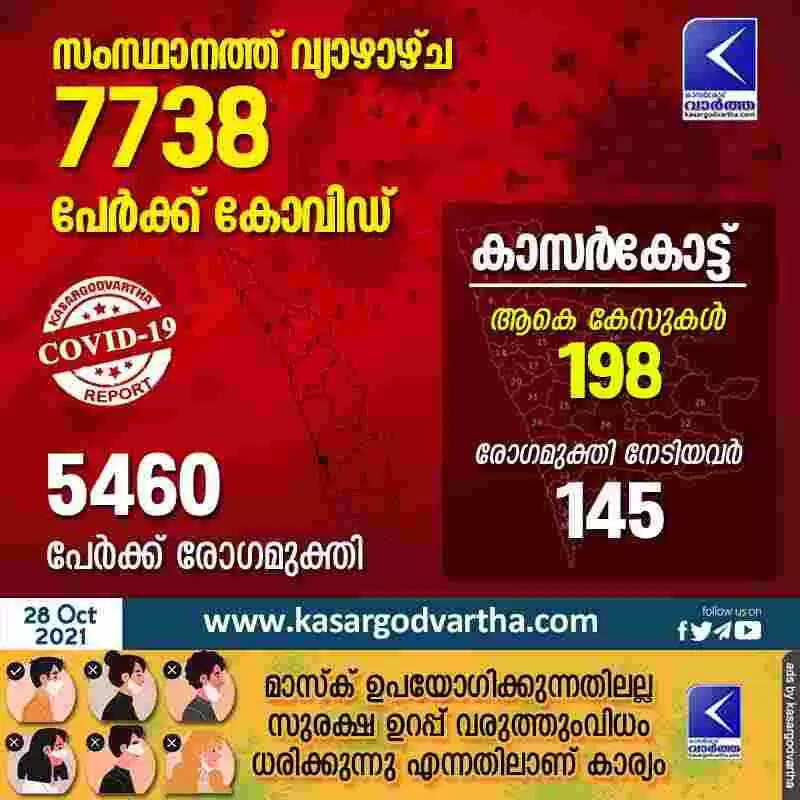 തിരുവനന്തപുരം: (www.kasargodvartha.com 28.10.2021) സംസ്ഥാനത്ത് ഇന്ന് 7738 പേര്‍ക്ക് കോവിഡ്-19 സ്ഥിരീകരിച്ചു. എറണാകുളം 1298, തിരുവനന്തപുരം 1089, തൃശൂര്‍ 836, കോഴിക്കോട് 759, കൊല്ലം 609, കോട്ടയം 580, പത്തനംതിട്ട 407, കണ്ണൂര്‍ 371, പാലക്കാട് 364, മലപ്പുറം 362, ഇടുക്കി 330, വയനാട് 294, ആലപ്പുഴ 241, കാസര്‍ഗോഡ് 198 എന്നിങ്ങനേയാണ് ജില്ലകളില്‍ ഇന്ന് രോഗ ബാധ സ്ഥിരീകരിച്ചത്.