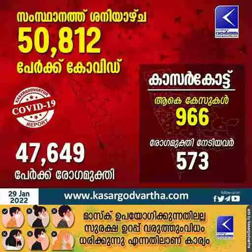 കേരളത്തില്‍ ശനിയാഴ്ച 50,812 പേര്‍ക്ക് കോവിഡ്: കാസർകോട് 966 പേര്‍