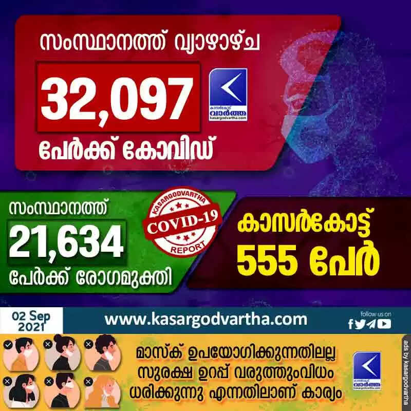 സംസ്ഥാനത്ത് വ്യഴാഴ്ച 32,097 പേര്‍ക്ക് കോവിഡ്-19 സ്ഥിരീകരിച്ചു.കാസര്‍ഗോഡ് 555 പേര്‍.