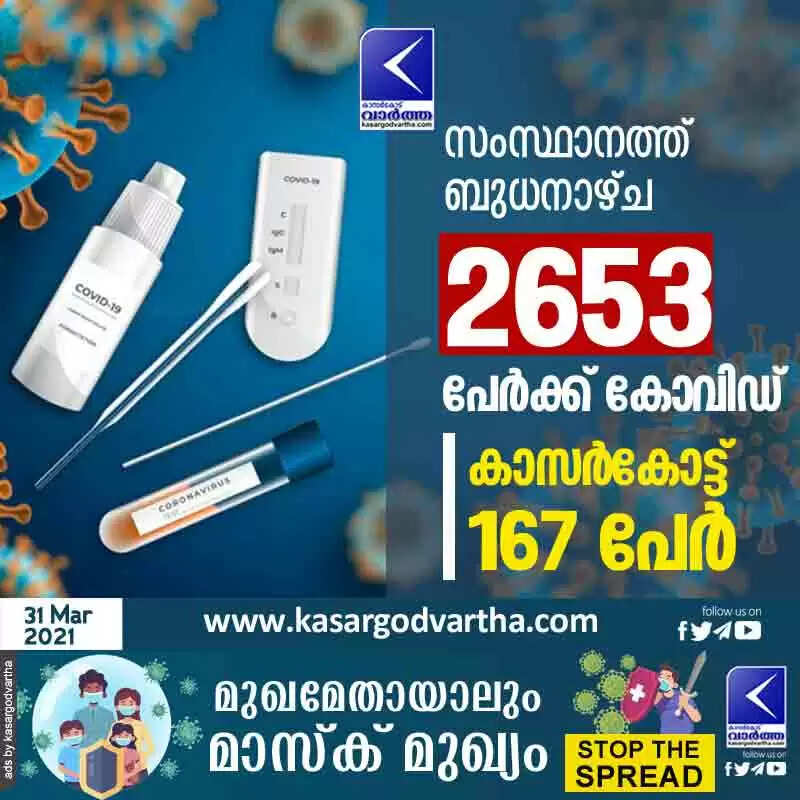 സംസ്ഥാനത്ത് ബുധനാഴ്ച 2653 പേര്ക്ക് കോവിഡ്; കാസര്കോട് 167 പേര്