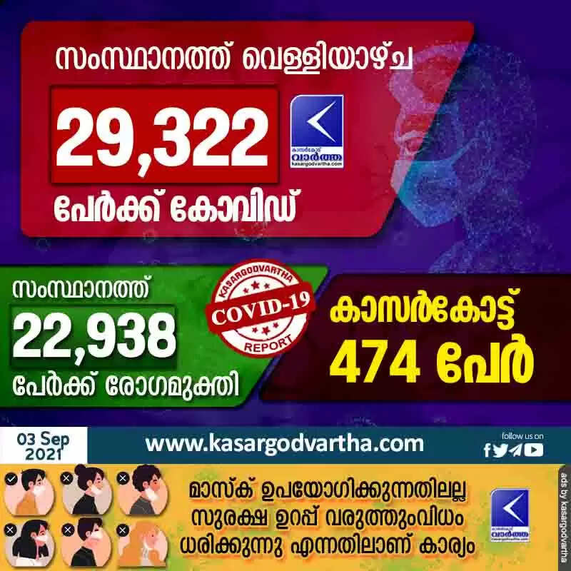 സംസ്ഥാനത്ത് വെള്ളിയാഴ്ച 29,322 പേര്ക്ക് കോവിഡ്-19 സ്ഥിരീകരിച്ചു.കാസര്ഗോഡ് 474 പേര്.