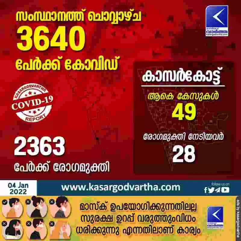 സംസ്ഥാനത്ത് ചൊവ്വാഴ്ച 3640 പേര്‍ക്ക് കോവിഡ്: കാസർകോട് 49 പേര്‍