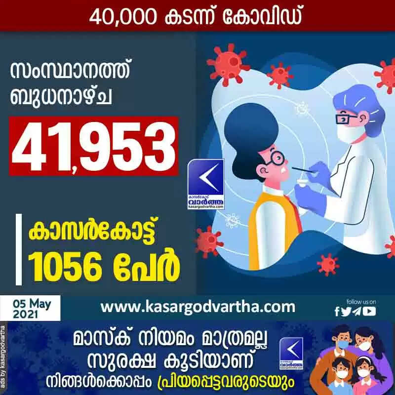സംസ്ഥാനത്ത് ബുധനാഴ്ച 41,953 പേര്‍ക്ക് കോവിഡ്; കാസര്‍കോട് 1056 പേര്‍