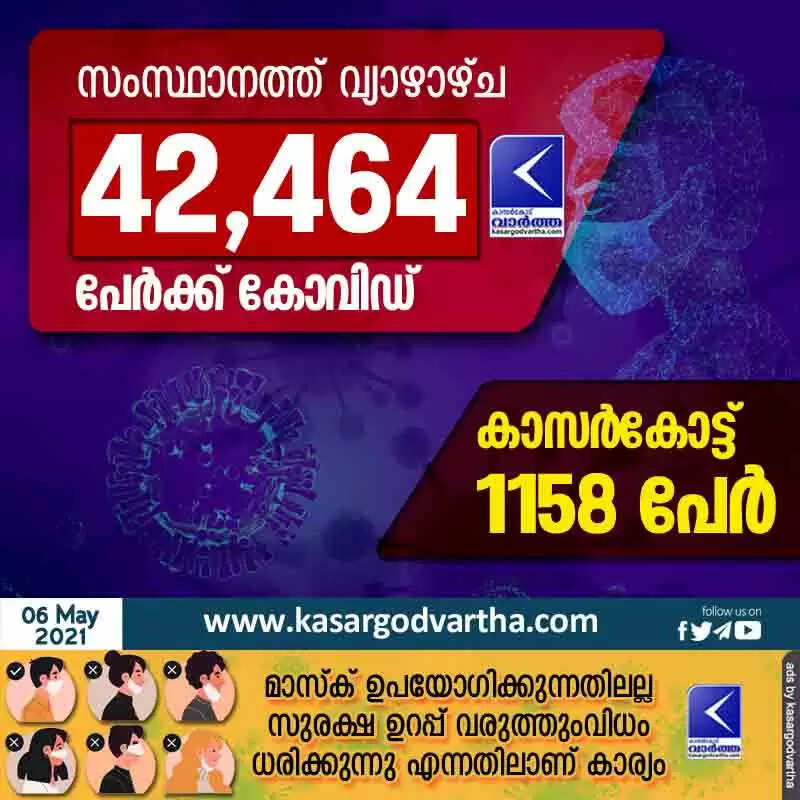 സംസ്ഥാനത്ത് വ്യാഴാഴ്ച 42,464 പേര്ക്ക് കോവിഡ്; കാസര്കോട് 1158 പേര്