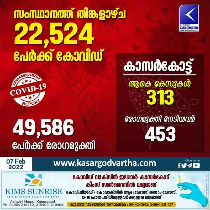കേരളത്തില് തിങ്കളാഴ്ച 22,524 പേര്ക്ക് കോവിഡ്: കാസർകോട് 313 പേര്