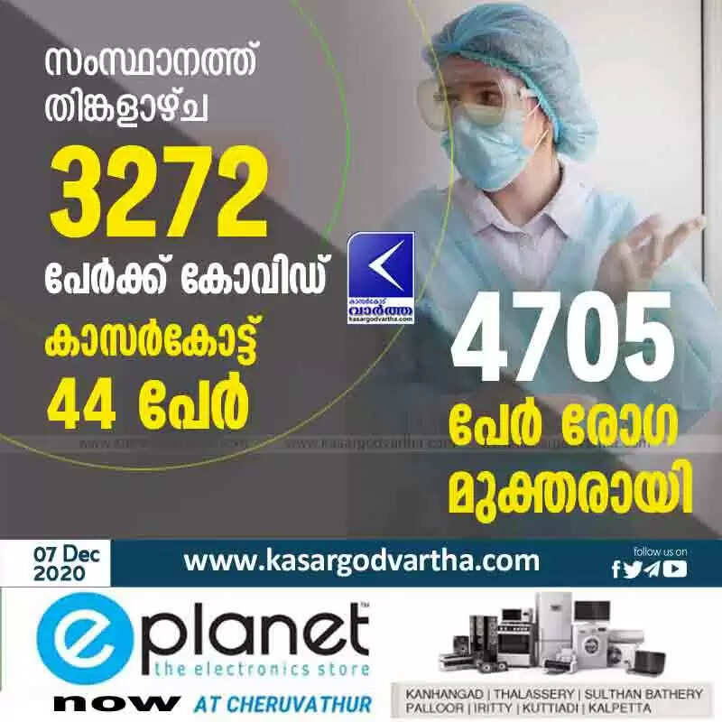 സംസ്ഥാനത്ത് തിങ്കളാഴ്ച 3272 പേര്ക്ക് കോവിഡ്; കാസര്കോട് 44 പേര്