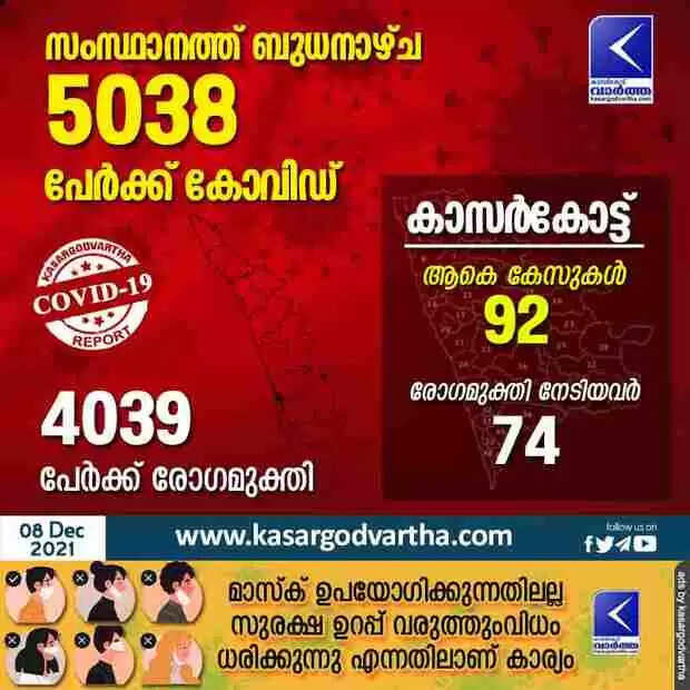 സംസ്ഥാനത്ത് ബുധനാഴ്ച 5038 പേര്ക്ക് കോവിഡ്-19 സ്ഥിരീകരിച്ചു