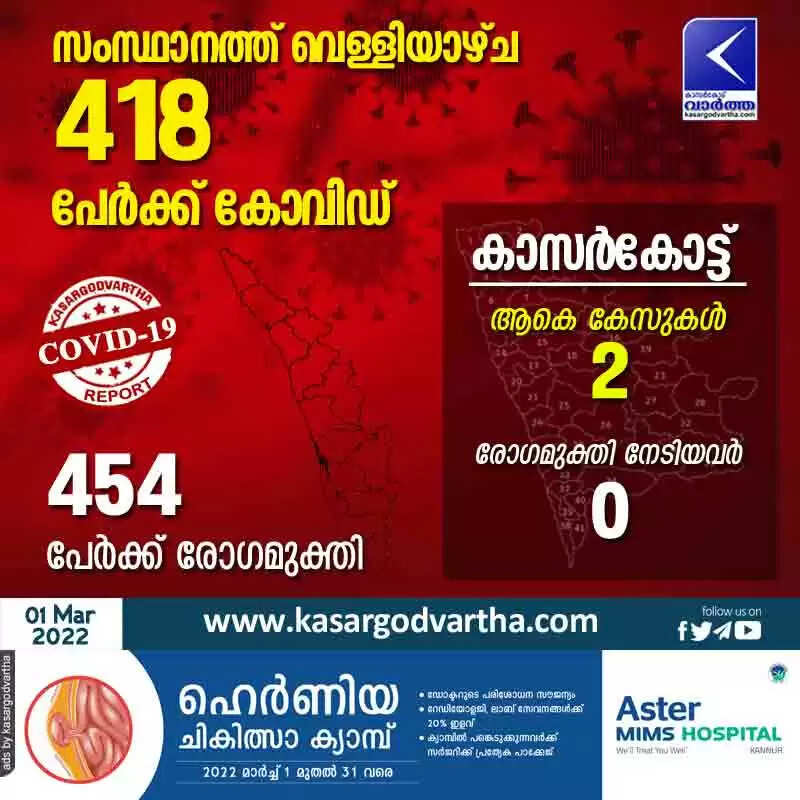 കേരളത്തില്‍ വെള്ളിയാഴ്ച 418 പേര്‍ക്ക് കോവിഡ്: കാസർകോട് 2 പേര്‍