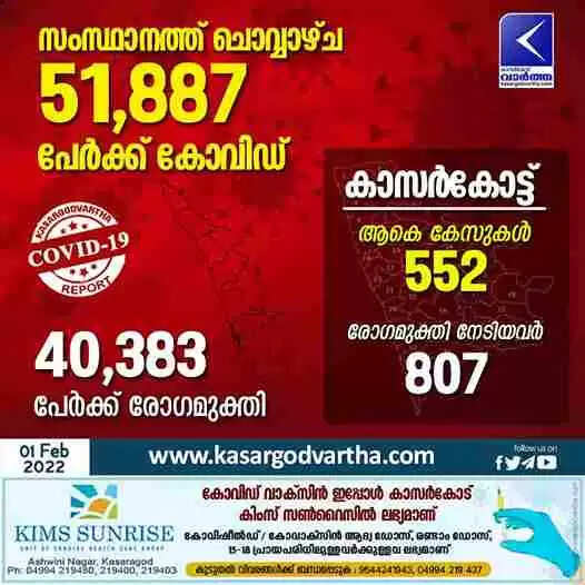 കേരളത്തില്‍ ചൊവ്വാഴ്ച 51,887 പേര്‍ക്ക് കോവിഡ്: കാസർകോട് 552 പേര്‍