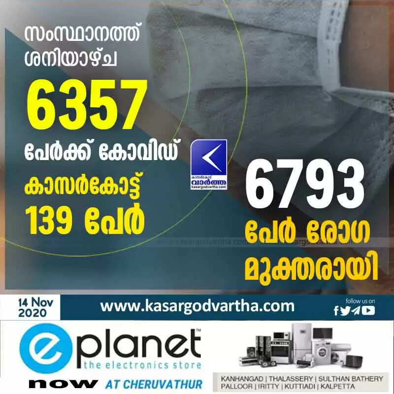 സംസ്ഥാനത്ത് ശനിയാഴ്ച 6357 പേര്ക്ക് കോവിഡ്; കാസര്കോട് 139 പേര്