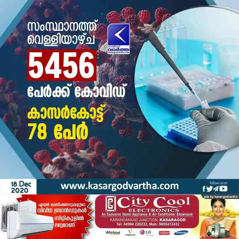സംസ്ഥാനത്ത് വെള്ളിയാഴ്ച 5456 പേര്‍ക്ക് കോവിഡ്; കാസര്‍കോട് 78 പേര്‍