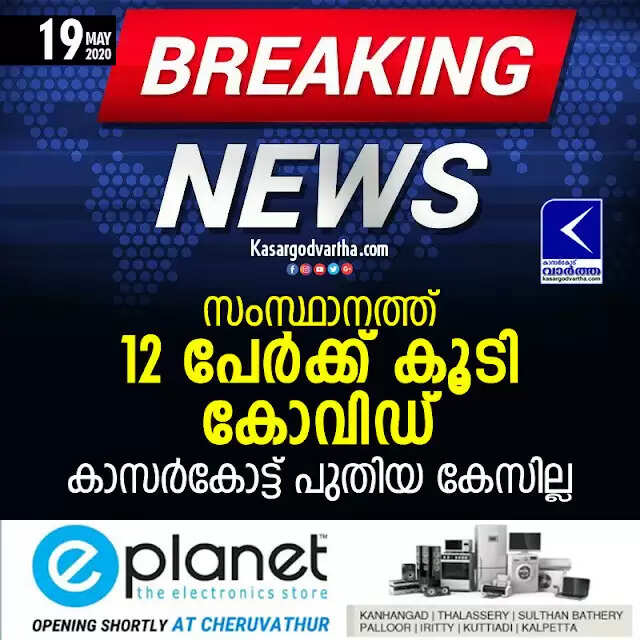 തിരുവന്തപുരം: (www.kasargodvartha.com 19.05.2020) സംസ്ഥാനത്ത് ചൊവ്വാഴ്ച 12 പേര്‍ക്ക് കൂടി കോവിഡ് സ്ഥിരീകരിച്ചതായി മുഖ്യമന്ത്രി വാര്‍ത്താ സമ്മേളനത്തില്‍ അറിയിച്ചു. ആരുടെയും പരിശോധനാ ഫലം നെഗറ്റീവായിട്ടില്ല. കണ്ണൂര്‍-5, മലപ്പുറം-3, പാലക്കാട്, പത്തനംതിട്ട, ആലപ്പുഴ, തൃശൂര്‍ എന്നിവിടങ്ങളില്‍ ഓരോ വീതവുമാണ് പോസിറ്റീവായത്.