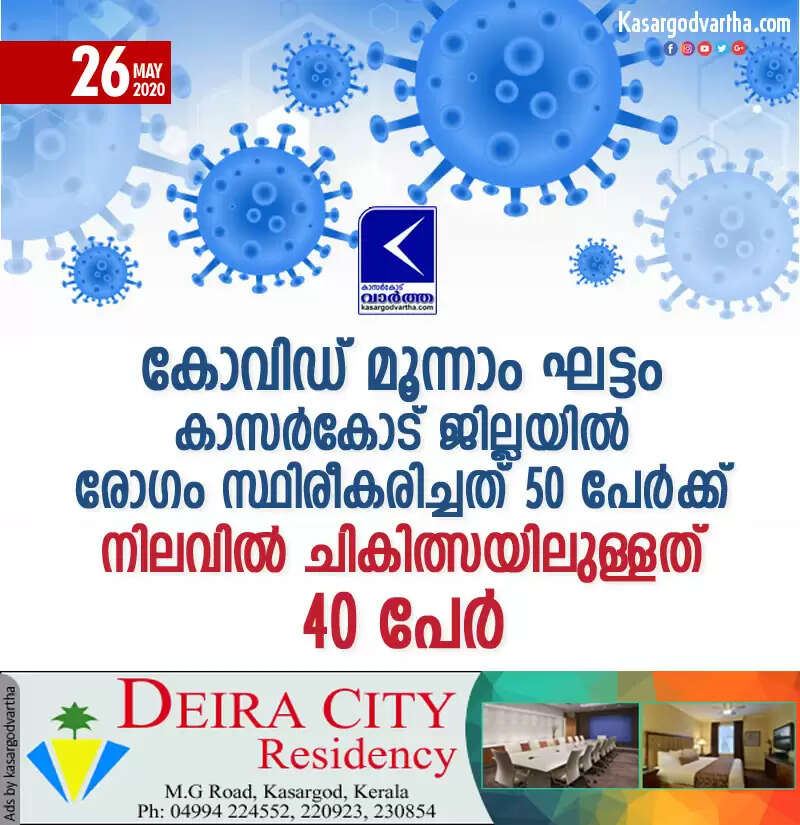 കോവിഡ് മൂന്നാം ഘട്ടം; കാസര്കോട് ജില്ലയില് രോഗം സ്ഥിരീകരിച്ചത് 50 പേര്ക്ക്, നിലവില് ചികിത്സയിലുള്ളത് 40 പേര്