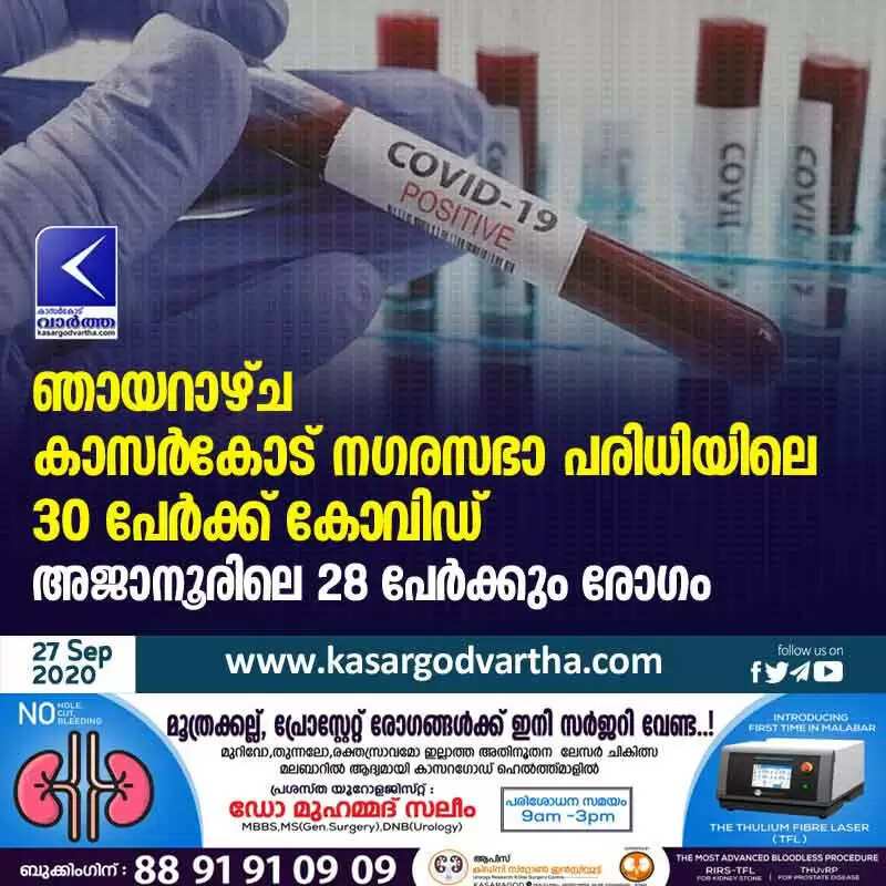 ഞായറാഴ്ച കാസര്കോട് നഗരസഭാ പരിധിയിലെ 30 പേർക്ക് കോവിഡ്; അജാനൂരിലെ 28 പേർക്കും രോഗം