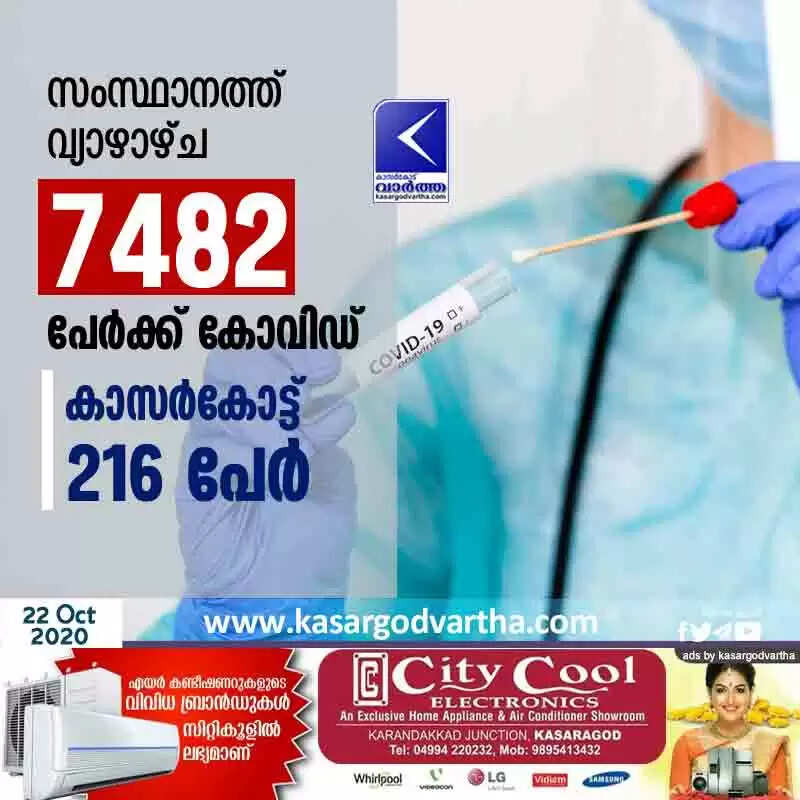 സംസ്ഥാനത്ത് വ്യാഴാഴ്ച 7482 പേര്ക്ക് കോവിഡ്; കാസര്കോട്ട് 216 പേര്