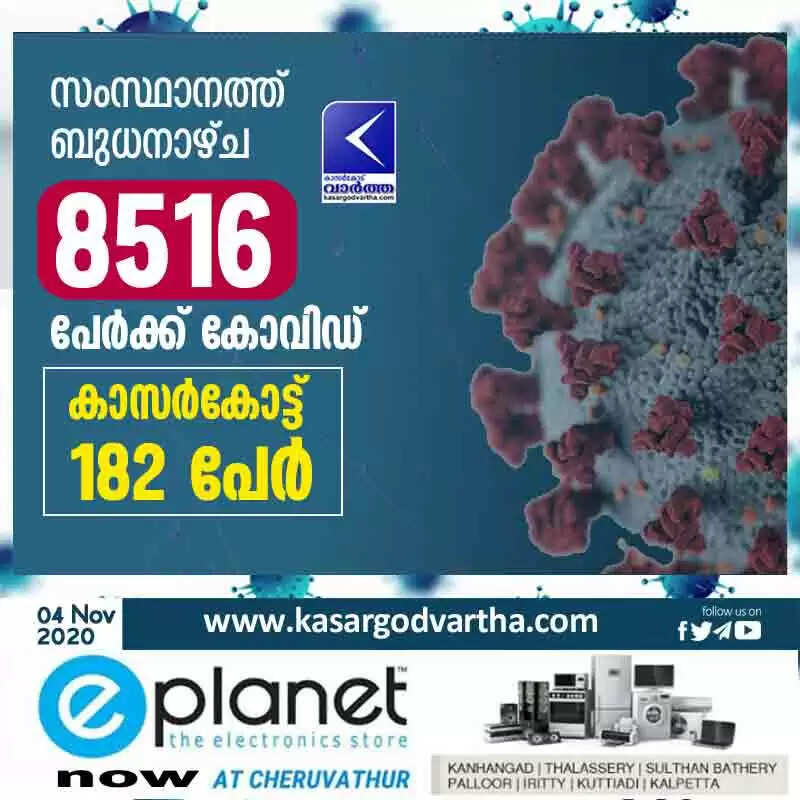 കാസര്‍കോട്: (www.kasargodvartha.com 04.11.2020) സംസ്ഥാനത്ത് ബുധനാഴ്ച 8516 പേര്‍ക്ക് കോവിഡ് സ്ഥിരീകരിച്ചു. എറണാകുളം 1197, തൃശൂര്‍ 1114, കോഴിക്കോട് 951, കൊല്ലം 937, മലപ്പുറം 784, ആലപ്പുഴ 765, തിരുവനന്തപുരം 651, കോട്ടയം 571, പാലക്കാട് 453, കണ്ണൂര്‍ 370, ഇടുക്കി 204, പത്തനംതിട്ട 186, കാസർകോട് 182, വയനാട് 151 എന്നിങ്ങനേയാണ് ജില്ലകളില്‍ ബുധനാഴ്ച രോഗ ബാധ സ്ഥിരീകരിച്ചത്.