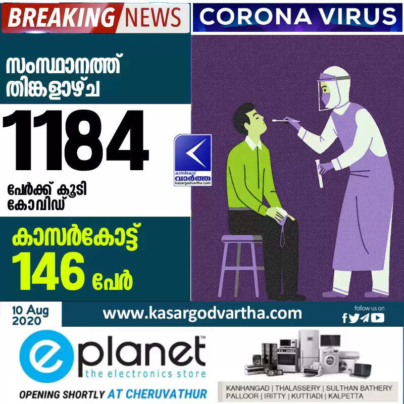 സംസ്ഥാനത്ത് തിങ്കളാഴ്ച 1184 പേര്ക്ക് കൂടി കോവിഡ്; കാസര്കോട്ട് 146 പേര്