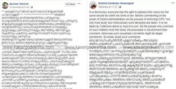Keywords: Kasaragod, Kerala, news, Muslim-league, District Collector, Social-Media, Top-Headlines, Trending, Curfew: Muslim league leader's FB post against Collector and collector's reply