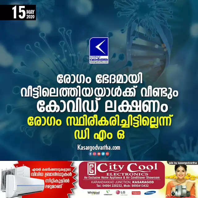 രോഗം ഭേദമായി വീട്ടിലെത്തിയയാള്‍ക്ക് വീണ്ടും കോവിഡ് ലക്ഷണം; രോഗം സ്ഥിരീകരിച്ചിട്ടില്ലെന്ന് ഡി എം ഒ