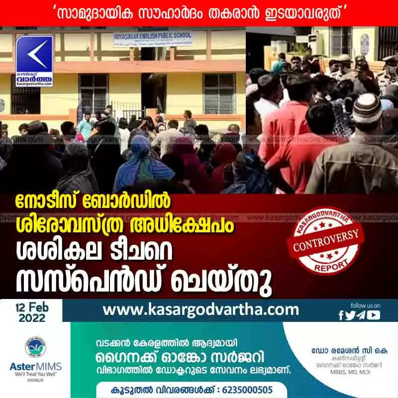 മംഗളുരു: (www.kasargodvartha.com 13.02.2022) ബെംഗളൂരു ചന്ദ്ര ലേഔടിലെ വിദ്യാസാഗര്‍ ഇന്‍ഗ്ലീഷ് പബ്ലിക് സ്‌കൂള്‍ അധ്യാപിക ശശികലയെ സര്‍വീസില്‍ നിന്ന് അന്വഷണ വിധേയമായി ശനിയാഴ്ച സസ്‌പെന്‍ഡ് ചെയ്തു. നോടീസ് ബോര്‍ഡ് ശിരോവസ്ത്രത്തെ അധിക്ഷേപിക്കാന്‍ ഉപയോഗിച്ചു എന്ന പരാതിയെത്തുടര്‍ന്നാണ് നടപടി.