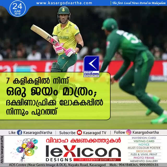 ലണ്ടന്‍: (www.kasargodvartha.com 24.06.2019) ഏഴ് കളികളില്‍ നിന്ന് ഒരു ജയം മാത്രം. ഇതോടെ ദക്ഷിണാഫ്രിക്കയുടെ ലോകകപ്പ് പ്രതീക്ഷ അവസാനിച്ചു. മിന്നും താരങ്ങളുണ്ടായിട്ടും ദക്ഷിണാഫ്രിക്കയെ നോക്കൗട്ടിലെത്തിക്കാനായില്ല. ഞായറാഴ്ച നടന്ന മത്സരത്തില്‍ പാക്കിസ്ഥാനെതിരെ 49 റണ്‍സിന് ദക്ഷിണാഫ്രിക്ക പരാജയപ്പെട്ടു. ആദ്യം ബാറ്റിംഗിനിറങ്ങിയ പാക്കിസ്ഥാന്‍ നിശ്ചിത 50 ഓവറില്‍ ഏഴ് വിക്കറ്റ് നഷ്ടത്തില്‍ 308 റണ്‍സ് നേടി. പാക്കിസ്ഥാനു വേണ്ടി ഹാരിസ് സുഹൈല്‍ 59 പന്തുകളില്‍ നിന്ന് 89 റണ്‍സ് അടിച്ചെടുത്തു. ബാബര്‍ അസം 80 പന്തുകളില്‍ നിന്ന് 69 റണ്‍സ് നേടി.