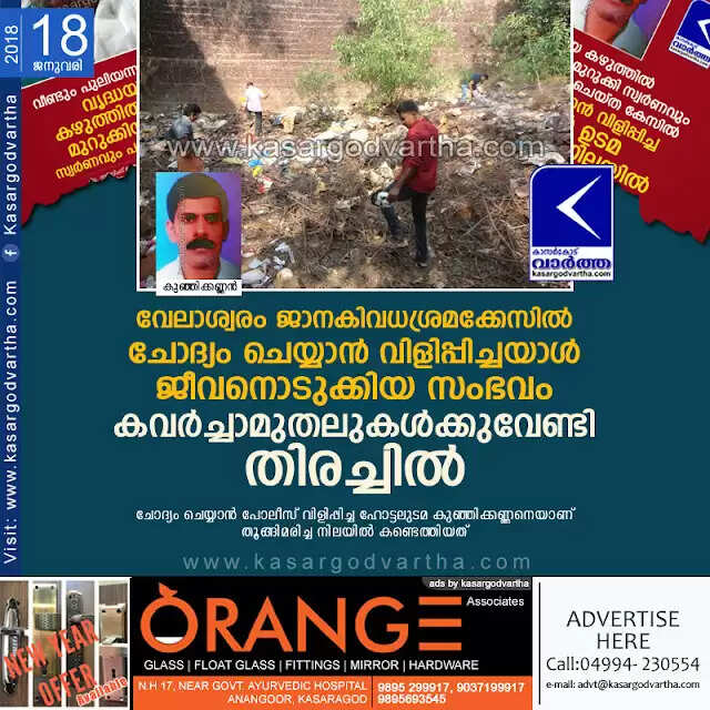 കാഞ്ഞങ്ങാട്: (www.kasargodvartha.com 18.01.2018) വേലാശ്വരത്ത് റിട്ട. നഴ്സിംഗ് അസി. ജാനകിയെ കഴുത്തിന് കേബിള്‍ കൊണ്ട് മുറുക്കി ബോധരഹിതയാക്കിയ ശേഷം കവര്‍ച്ച നടത്തിയ സംഭവത്തില്‍ ചോദ്യം ചെയ്യാന്‍ പോലീസ് വിളിപ്പിച്ച ഹോട്ടലുടമ കുഞ്ഞിക്കണ്ണന്‍ ദുരൂഹ സാഹചര്യത്തില്‍ ആത്മഹത്യ ചെയ്തതിനെ തുടര്‍ന്ന് കവര്‍ച്ചാ മുതലുകള്‍ക്കായി പോലീസ് തെരച്ചില്‍ ഊര്‍ജിതമാക്കി. കുഞ്ഞിക്കണ്ണന്റെയും ജാനകിയുടെയും വീടിന്റെ പരിസരങ്ങളിലും സമീപത്തെ ചെങ്കല്‍ ക്വാറിയിലും മാലിന്യ നിക്ഷേപ കേന്ദ്രങ്ങളിലും വ്യാഴാഴ്ച രാവിലെ മുതല്‍ പോലീസ് സംഘം അരിച്ചുപെറുക്കി. തെരച്ചിലില്‍ നാട്ടുകാരും പോലീസിനെ സഹായിക്കുന്നുണ്ട്.