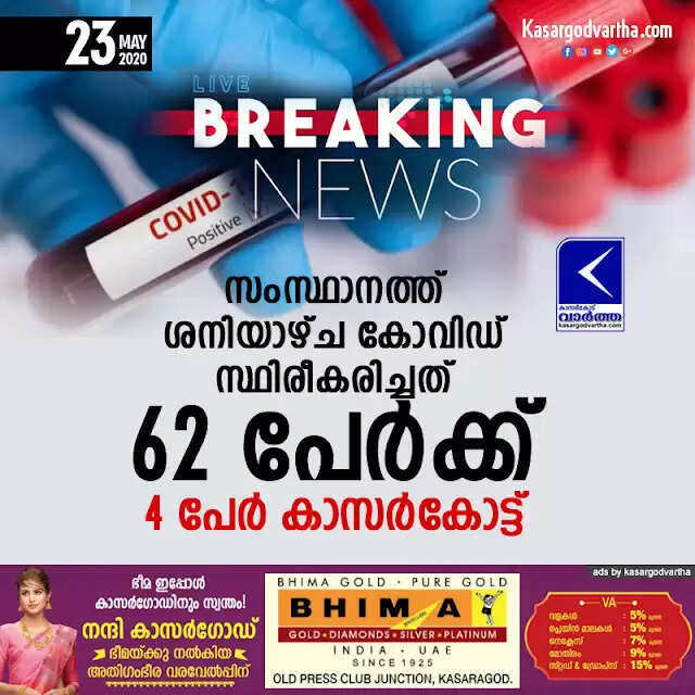 സംസ്ഥാനത്ത് ശനിയാഴ്ച കോവിഡ് സ്ഥിരീകരിച്ചത് 62 പേര്‍ക്ക്; 4 പേര്‍ കാസര്‍കോട്ട്