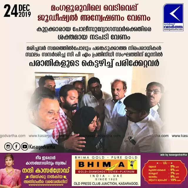മംഗളൂരുവിലെ വെടിവെപ്പ്: ജൂഡീഷ്യല് അന്വേഷണം വേണം, കുറ്റക്കാരായ പോലീസുദ്യോഗസ്ഥര്ക്കെതിരെ ശക്തമായ നടപടി വേണം, മരിച്ചവര് സമരത്തില്പോലും പങ്കെടുക്കാത്ത നിരപരാധികള്, സ്ഥലം സന്ദര്ശിച്ച സി പി എം പ്രതിനിധി സംഘത്തിന് മുന്നില് പരാതികളുടെ കെട്ടഴിച്ച് പരിക്കേറ്റവര്