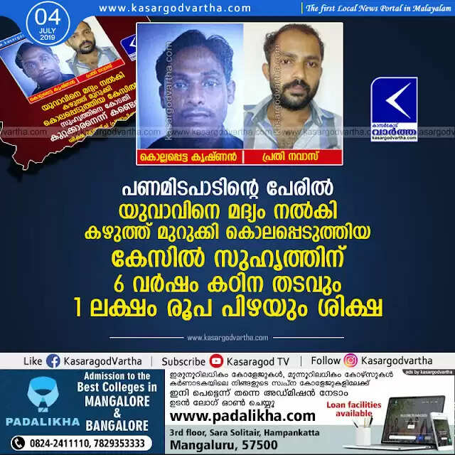 കാസര്‍കോട്: (www.kasargodvartha.com 04.06.2019) പണമിടപാടിന്റെ പേരില്‍ യുവാവിനെ മദ്യം നല്‍കി കഴുത്ത് മുറുക്കി കൊലപ്പെടുത്തിയ കേസില്‍ പ്രതിയായ സുഹൃത്തിനെ ആറു വര്‍ഷം കഠിന തടവിനും ഒരു ലക്ഷം രൂപ പിഴയക്കാനും കോടതി ശിക്ഷിച്ചു. ചട്ടഞ്ചാല്‍ പുത്തരിയടുക്കത്തെ മാവിലന്റെ മകന്‍ സി കൃഷ്ണനെ (28) കൊലപ്പെടുത്തിയ സംഭവത്തില്‍ ചട്ടഞ്ചാല്‍ കെട്ടിനുള്ളിലെ നവാസിനെ (28) യാണ് കാസര്‍കോട് ജില്ലാ അഡീ. സെഷന്‍സ് കോടതി (രണ്ട്) ജഡ്ജ് രാജന്‍ തട്ടില്‍ ശിക്ഷിച്ചത്. പിഴയടച്ചില്ലെങ്കില്‍ ഒരു വര്‍ഷം അധികം തടവ് അനുഭവിക്കണം.