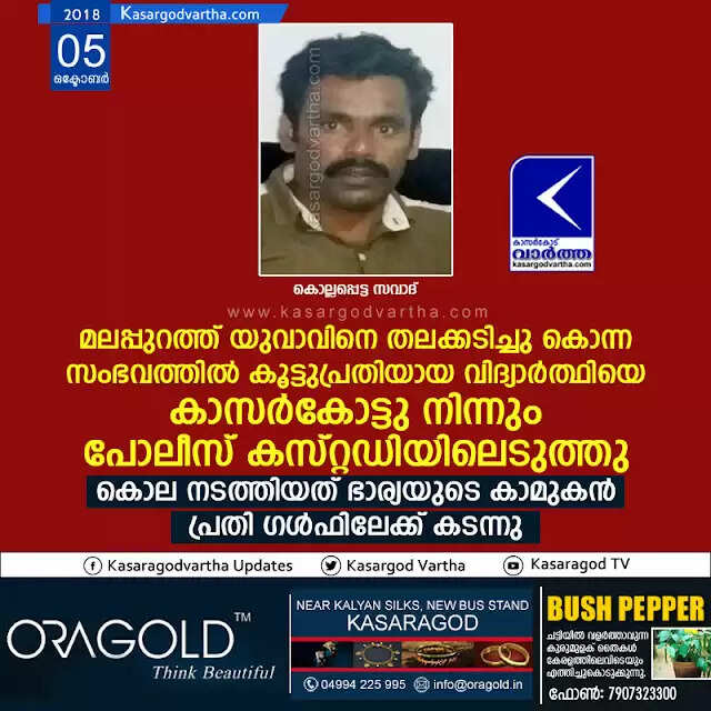 മലപ്പുറത്ത് യുവാവിനെ തലക്കടിച്ചു കൊന്ന സംഭവത്തില് കൂട്ടുപ്രതിയായ വിദ്യാര്ത്ഥിയെ കാസര്കോട്ടു നിന്നും പോലീസ് കസ്റ്റഡിയിലെടുത്തു; കൊല നടത്തിയത് ഭാര്യയുടെ കാമുകന്, പ്രതി ഗള്ഫിലേക്ക് കടന്നു