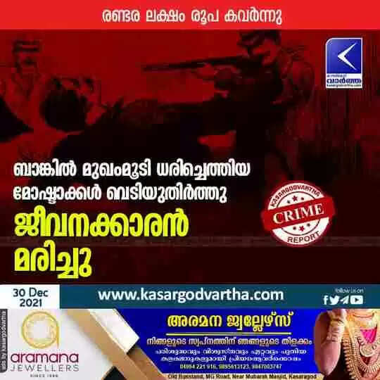 ബാങ്കിൽ മുഖംമൂടി ധരിച്ചെത്തിയ മോഷ്ടാക്കൾ വെടിയുതിർത്തു; ജീവനക്കാരൻ മരിച്ചു; രണ്ടര ലക്ഷം രൂപ കവർന്നു