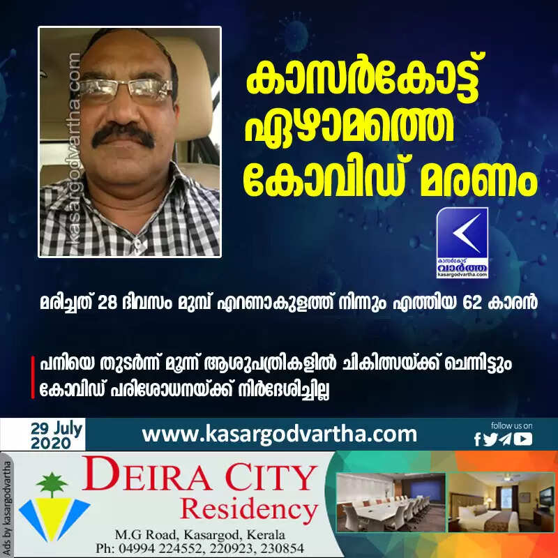 കാസര്കോട്ട് ഏഴാമത്തെ കോവിഡ് മരണം; മരിച്ചത് 28 ദിവസം മുമ്പ് എറണാകുളത്ത് നിന്നും എത്തിയ 62 കാരന്; പനിയെ തുടര്ന്ന് മൂന്ന് ആശുപത്രികളില് ചികിത്സയ്ക്ക് ചെന്നിട്ടും കോവിഡ് പരിശോധനയ്ക്ക് നിര്ദേശിച്ചില്ല
