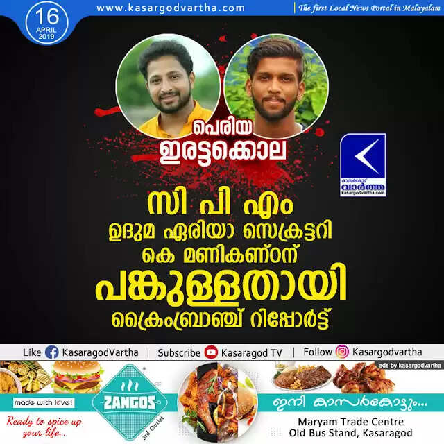 പെരിയ ഇരട്ടക്കൊല: സി പി എം ഉദുമ ഏരിയാ സെക്രട്ടറി കെ മണികണ്ഠന് പങ്കുള്ളതായി ക്രൈംബ്രാഞ്ച് റിപ്പോര്ട്ട്