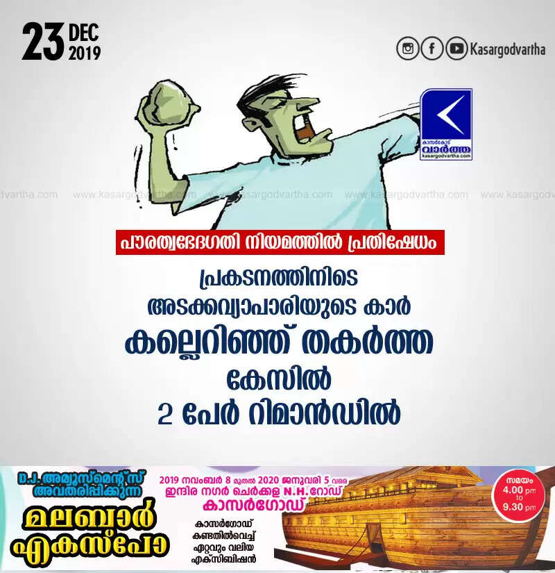 പൗരത്വഭേദഗതി നിയമത്തില് പ്രതിഷേധം: പ്രകടനത്തിനിടെ അടക്കവ്യാപാരിയുടെ കാര് കല്ലെറിഞ്ഞ് തകര്ത്ത കേസില് 2 പേര് റിമാന്ഡില്