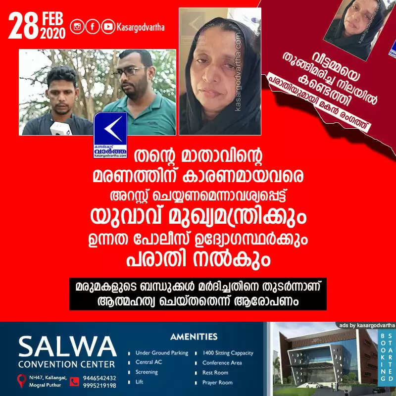 Keywords: Trending, Death, kasaragod, Chemnad, Kerala, news, suicide, Hanged, Death, The youth will lodge a complaint to the chief minister and top police officials demanding the arrest of those responsible for his mother's death < !- START disable copy paste -->