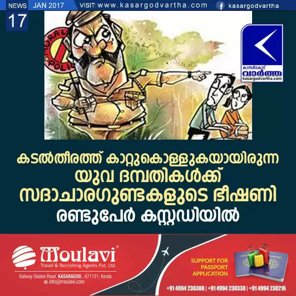 കടല്തീരത്ത് കാറ്റുകൊള്ളുകയായിരുന്ന യുവ ദമ്പതികള്ക്ക് സദാചാരഗുണ്ടകളുടെ ഭീഷണി; രണ്ടുപേര് കസ്റ്റഡിയില്