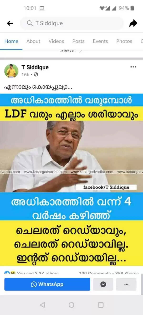 അവന്റെ ഈ വാക്യമാണ് ട്രോൾ ലോകം ഏറ്റെടുത്തിരിക്കുന്നത്. ഒപ്പം മുഖ്യ മന്ത്രി പിണറായി വിജയനെ ട്രോളി കോഴിക്കോട് ഡി സി സി പ്രസിഡന്റ് ടി സിദ്ദിഖും രംഗത്തെത്തി.