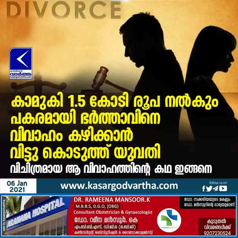 ഭോപ്പാൽ: (www.kasargodvartha.com 06.01.2021) കാമുകി 1.5 കോടി രൂപ നൽകുമെന്ന് അറിയിക്കുകയും പകരമായി ഭർത്താവിനെ വിവാഹം കഴിക്കാൻ വിട്ടു കൊടുക്കാൻ സമ്മതിക്കുകയും ചെയ്ത് യുവതി. മധ്യപ്രദേശിലെ ഭോപ്പാലിലാണ് സംഭവം. ഭോപ്പാലിലെ കുടുംബ കോടതിയിലെത്തിയ ഒരു പെൺകുട്ടിയുടെ ഹർജിയുടെ പിന്നാമ്പുറ കഥയാണ് പുറത്ത് വന്നത്.
