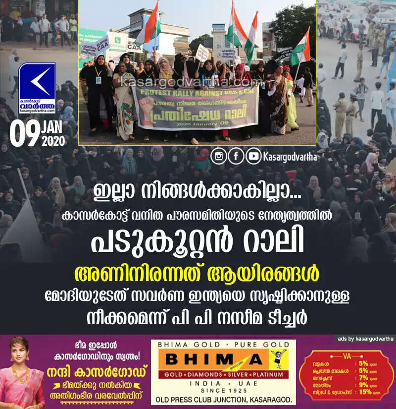 ഇല്ലാ നിങ്ങള്ക്കാകില്ലാ...കാസര്കോട്ട് വനിത പൗരസമിതിയുടെ നേതൃത്വത്തില് പടുകൂറ്റന് റാലി; അണിനിരന്നത് ആയിരങ്ങള്; മോദിയുടേത് സവര്ണ ഇന്ത്യയെ സൃഷ്ടിക്കാനുള്ള നീക്കമെന്ന് പി പി നസീമ ടീച്ചര്