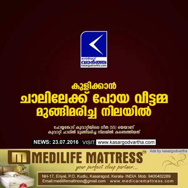 നീലേശ്വരം: (www.kasargodvartha.com 23/07/2016) കുളിക്കാന്‍ ചാലിലേക്ക് പോയ വീട്ടമ്മയെ മുങ്ങിമരിച്ച നിലയില്‍ കണ്ടെത്തി. ചോയ്യങ്കോട് കൂവാറ്റിയിലെ പരേതനായ കുഞ്ഞികൃഷ്ണന്റെ ഭാര്യ കണ്ടത്തുപുരയില്‍ ഗീത ( 55) യെയാണ് കൂവാറ്റി ചാലില്‍ മുങ്ങിമരിച്ച നിലയില്‍ കണ്ടെത്തിയത്.