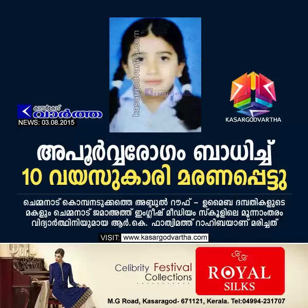 Keywords : Kasaragod, Chemnad, Obituary, Kerala, Disease, R.K. Fathimath Rahiba, Treatment, Student, 10 year old after rare illness