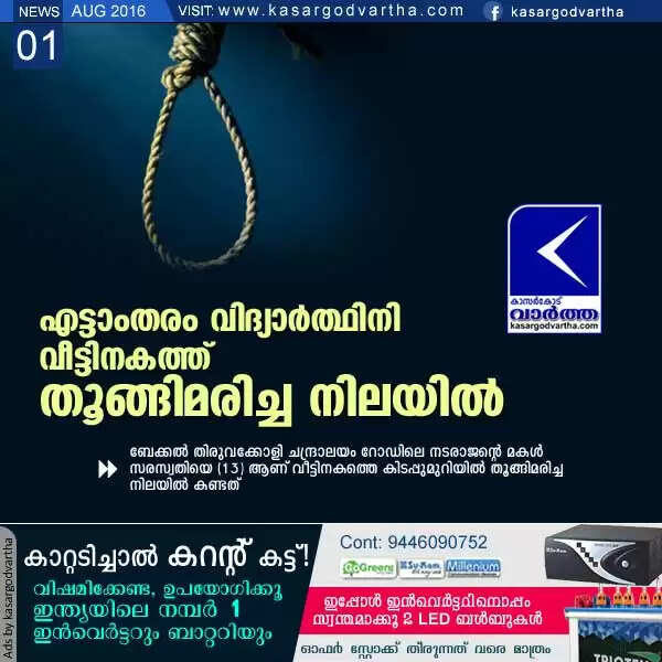 Keywords : Bekal, Student, Death, Udma, Obituary, House, Police, Kasaragod, Saraswathi, 13 year old girl found dead hanged.