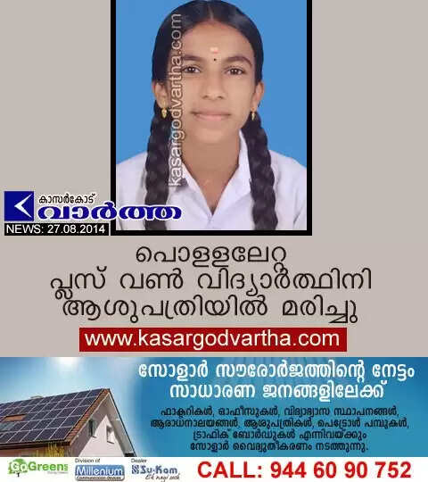 പെരിയ: (www.kasargodvartha.com 27.08.2014) പൊള്ളലേറ്റ് മംഗലാപുരം ഫാദര്‍ മുള്ളേഴ്‌സ് ആശുപത്രിയില്‍ ചികിത്സയിലായിരുന്ന പ്ലസ് വണ്‍ വിദ്യാര്‍ത്ഥിനി മരിച്ചു. പെരിയ ആലക്കോട്ടെ പി.വി. കുഞ്ഞമ്പു - സിന്ധു ദമ്പതികളുടെ മകളും പെരിയ ഗവ. ഹയര്‍സെക്കന്‍ഡറി സ്‌കൂളിലെ പ്ലസ് വണ്‍ വിദ്യാര്‍ത്ഥിനിയുമായ ഷിജിനയാണ് (16) മരിച്ചത്.